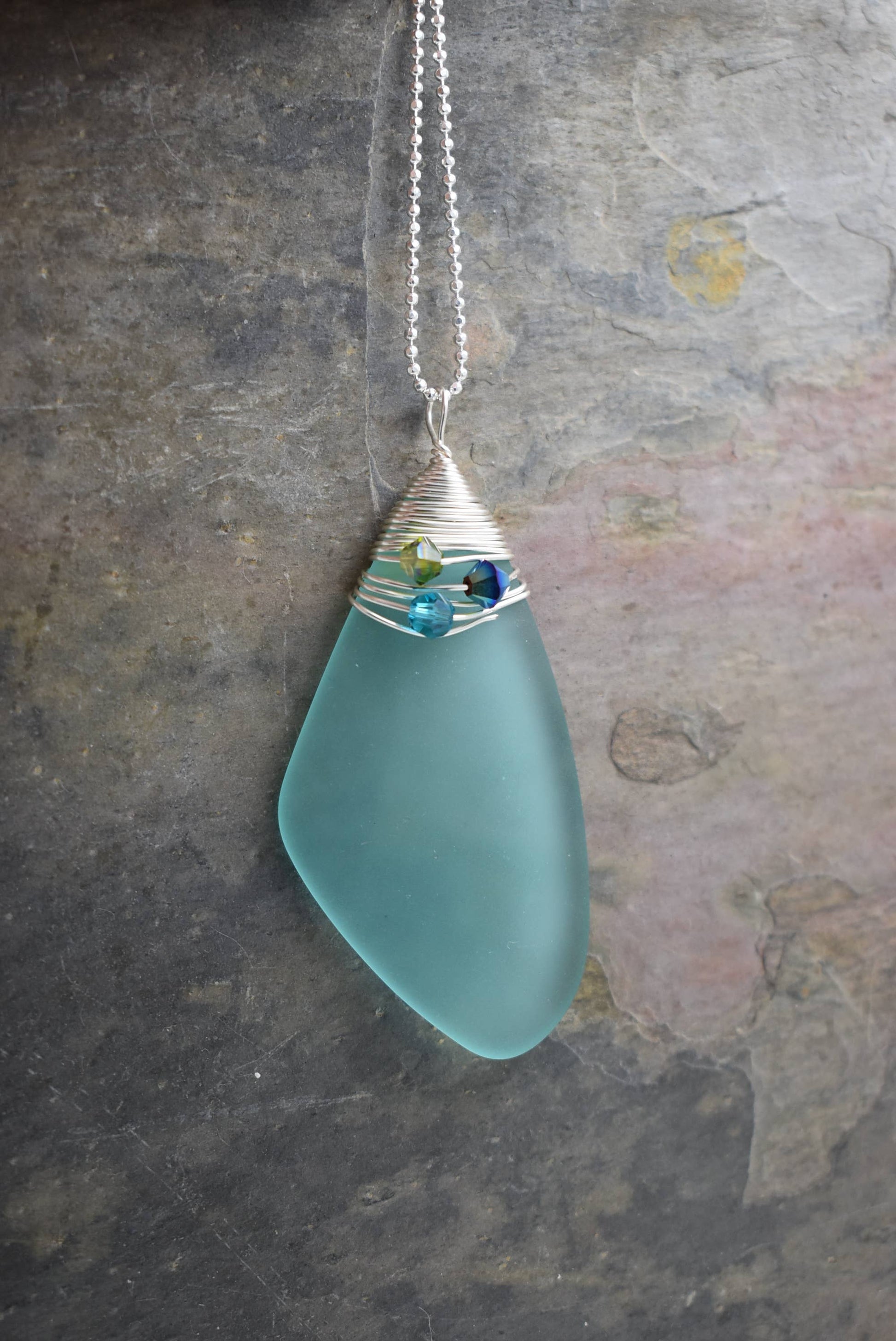 Adorned with sparkling Swarovski crystals in green and aqua hues, this necklace adds a touch of coastal elegance to any outfit. Suspended from a sterling silver 30" chain, it’s both timeless and sustainable — a perfect gift or personal treasure. 💚💙