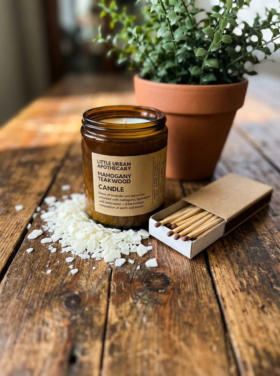 Immerse yourself in the warm, refined aroma of Mahogany Teakwood. This handcrafted soy candle opens with subtle notes of lavender and geranium, leading into the rich heart of mahogany and teakwood. The base of cedarwood, oak, and sandalwood creates a grounding finish that’s both smooth and sophisticated.